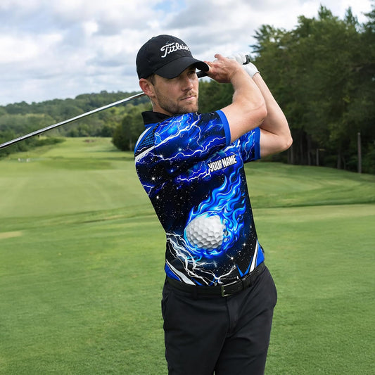 Custom Name Golf Polo Shirt Blue Flame Golf Ball Lightning Performance Polo for Men