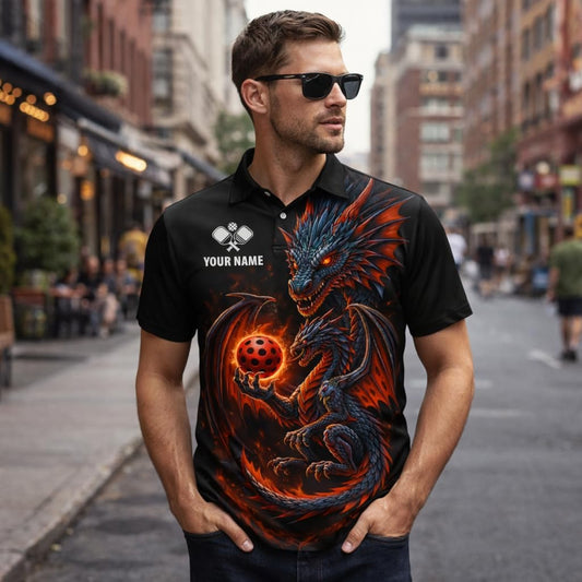 Custom Dragon Pickleball Polo Shirt Personalized Name Team Pickleball Shirt 3D Fire Dragon Design Black