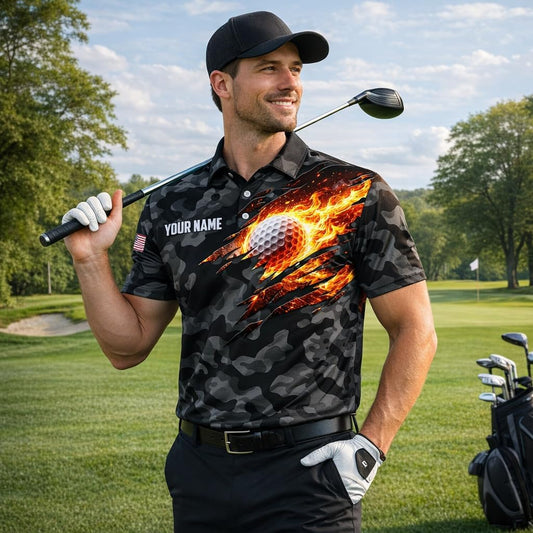 Custom Name Camo Golf Polo Shirt Flaming Ball