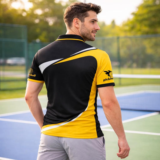 Custom Name Pickleball Fire Heart Polo Shirt Black Yellow