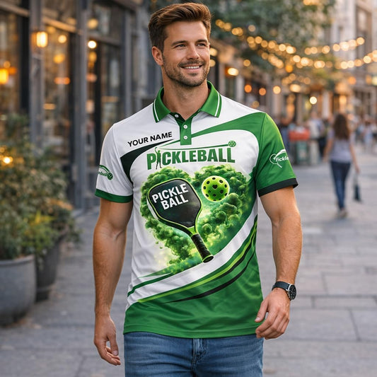 Custom Name Pickleball Heart Polo Shirt Green White Performance