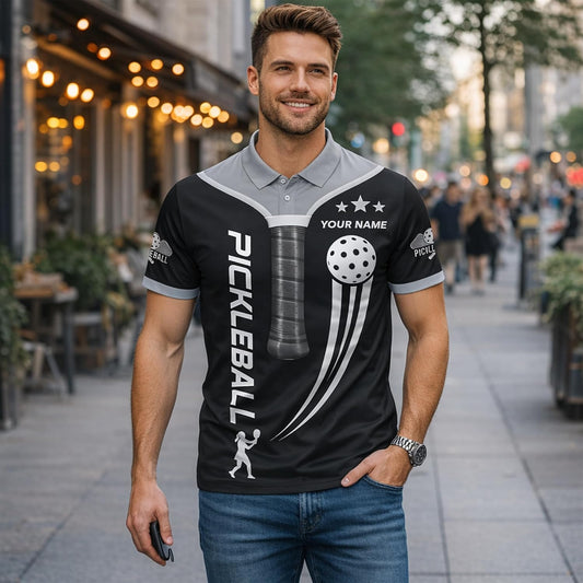 Custom Name Pickleball Polo Shirt Black Silver Performance Mesh Sports Polo for Men Women