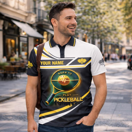 Custom Name Pickleball Polo Shirt Born to Play Pickleball Paddle Performance Shirt Black Gold