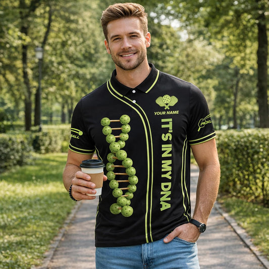 Custom Name Pickleball Polo Shirt It's in My DNA Pickleball DNA Graphic Performance Shirt Black Green