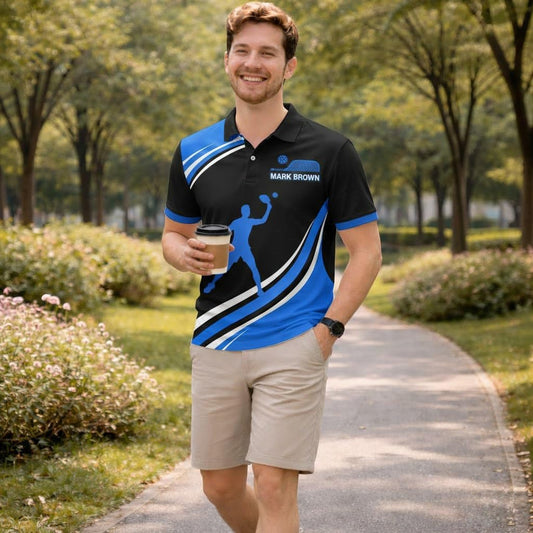 Custom Name Pickleball Team Polo Shirt Black Blue Performance Short Sleeve Athletic Jersey
