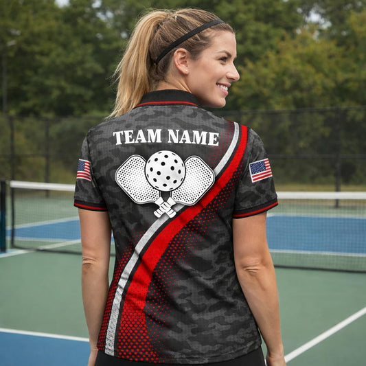 Custom Name Pickleball Polo Shirt Black Red Camo Performance Team Jersey Unisex Sports Polo